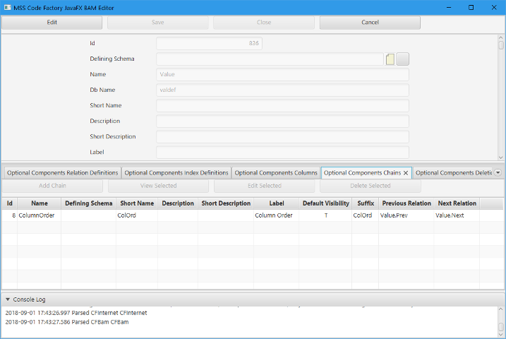 Chains are a very special construct that is used to allow the user to control the sorting of objects for display and processing by implementing a double-linked list over Prev and Next relations for the table that specifies the Chain. These Prev and Next relations need to be named exactly that, because the code for the stored procedures to implement chains is incredibly complex and I could not figure out a way to probe the relation names so I had to hardcode a lot of the prefixes and suffixes and variable names in the procedures.